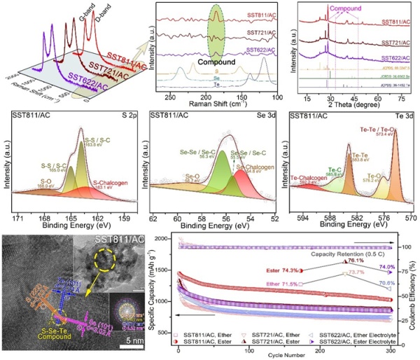 如圖1所示,Raman光譜、XRD和XPS譜圖中出現(xiàn)了有別于S、Se、Te單一組分的新的特征峰,HRTEM圖中也出現(xiàn)了基于S-Se-Te的晶格條紋,表明該正極材料并非S、Se、Te三種組分簡單的物理混合,而是彼此鍵合形成一種新型的三元化合物。該SST/AC復(fù)合電極在醚類和酯類電解液中均表現(xiàn)出優(yōu)于單一S的電化學(xué)性能。在酯類電解液中,電池在0.5C電流密度下循環(huán)300圈后仍能保持1024.9mAh·g-1的高比容量,且在酯類和醚類電解液中容量保持率均能達到70%以上,表現(xiàn)出良好的兼容性。此外,S、Se和Te的三元協(xié)同效應(yīng)可有效提升材料的導(dǎo)電性能,顯著降低電荷傳輸能壘,從而減小充放電過程中的電化學(xué)極化,改善了材料的庫倫效率和循環(huán)性能。