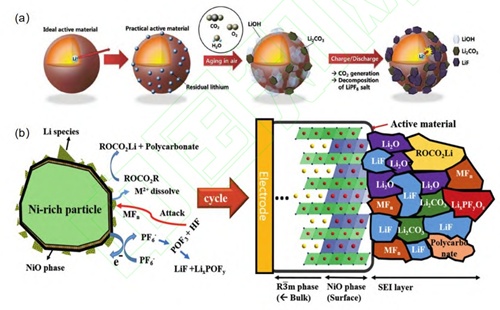 (a)高鎳三元正極材料表面副反應;(b)富鎳正極材料固體-電解質界面的微觀結構和組成(來源:栗志展等,高鎳三元層狀鋰離子電池正極材料:研究進展、挑戰及改善策略)