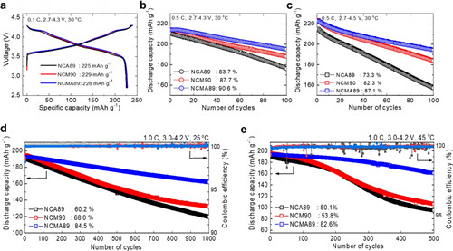 NCA89、NCM90和NCMA89陰極的電化學性能比較(來源:Un-Hyuck Kim,Chong S.Yoon,et al,Quaternary Layered Ni-Rich NCMA Cathode for Lithium-Ion Batteries)