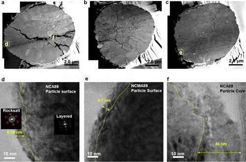 陰極在100次循環后的TEM掃描圖像:(a)NCA89,(b)NCM90,(c)NCMA89(來源:Un-Hyuck Kim,Chong S.Yoon,et al,Quaternary Layered Ni-Rich NCMA Cathode for Lithium-Ion Batteries)