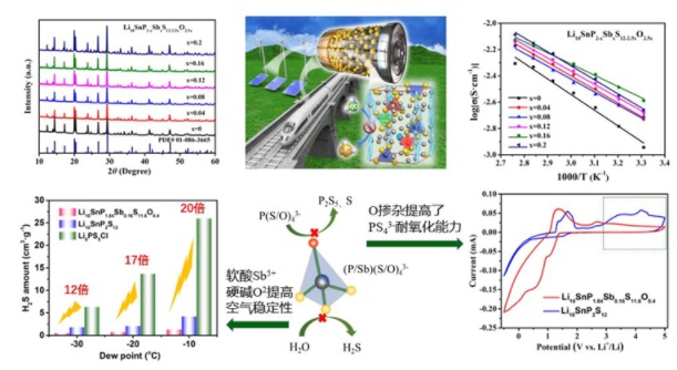 在此基礎上,針對硫化物電解質空氣穩定性的研究,該科研團隊近期又取得關鍵性進展,通過軟酸Sb5+和硬堿O2-對Li10SnP2S12電解質進行雙摻雜,一方面束縛了S2-從晶格中逃逸,避免生成H2S;另一方面增強了P-S鍵的強度,抑制了電解質在高電位下氧化為P2S5和S。在-10℃露點下,空氣穩定性較Li6PS5Cl提高近20倍,從而獲得了兼具高離子電導率、電化學穩定性和空氣穩定性優異的硫化物電解質材料。