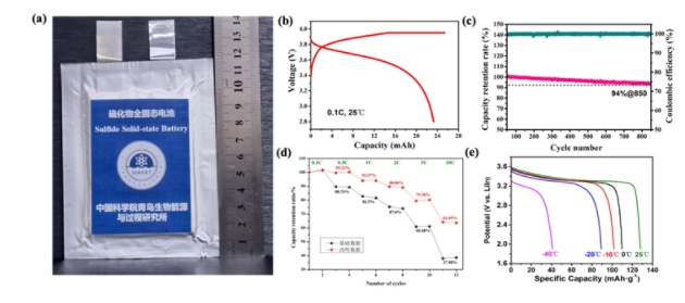 為了突破硫化物全固態軟包鋰電池工業化制備的技術瓶頸,該科研團隊自主創新了多項關鍵技術:制備出厚度低于20μm的超薄電解質膜技術;開發高穩定性電極包覆技術;構建了穩定的電極/電解質界面技術;勻漿、涂布、電極成型等技術;成功開發出具有優異倍率和低溫性能的軟包電池(10C(6min)倍率下充電,容量達到63.5%,-40℃下放電容量達31%);率先突破全固態軟包鋰電池循環壽命差的技術難點,成功開發出長循環壽命的全固態軟包鋰電池,循環850次,容量保持率為94%。