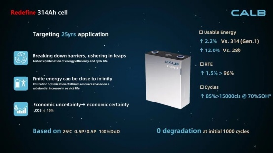據(jù)介紹,中創(chuàng)新航升級(jí)后的314Ah電芯采用了突破性的補(bǔ)鋰技術(shù),循環(huán)壽命大幅提升至超過15000次,可以支撐長達(dá)25年的儲(chǔ)能系統(tǒng)運(yùn)行周期,為客戶提供了更具性價(jià)比的儲(chǔ)能解決方案。