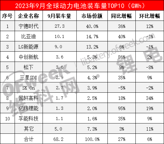 圖:2023年9月全球動力電池裝車量排行榜