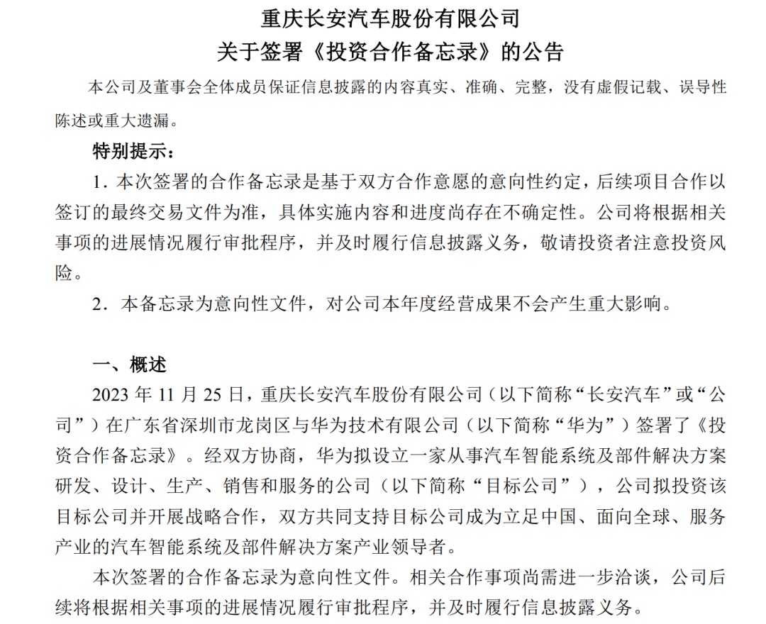 11月26日,長安汽車發布公告稱,公司與華為于25日在深圳簽署《投資合作備忘錄》。公告顯示,經雙方協商,華為擬設立一家從事汽車智能系統及部件解決方案研發、設計、生產、銷售和服務的公司,長安汽車擬投資該公司并開展戰略合作,雙方共同支持該公司成為立足中國、面向全球、服務產業的汽車智能系統及部件解決方案產業領導者。