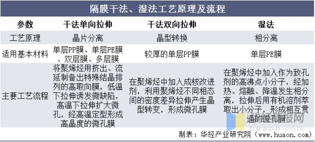 隔膜的生產工藝主要分為濕法和干法兩類。鋰離子電池隔膜生產工藝包括原材料配方和快速配方調整、微孔制備技術、成套設備自主設計等工藝。其中,微孔制備技術是鋰離子電池隔膜制備工藝的核心,按照其工藝類型可以分為干法拉伸(單向和雙向拉伸兩種)和濕法工藝兩類。