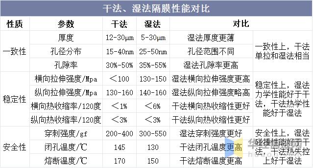 從干法與濕法性能對比來看,干法隔膜安全性高,且成本較低,因此大多應用于大型磷酸鐵鋰動力鋰電池中;而濕法隔膜由于厚度更薄、孔隙率高,孔徑的均勻性和透氣率較高,相比干法隔膜在力學性能、透氣性能和理化性能方面均具有一定優勢,因此在重視能量密度的三元電池中應用更廣泛。