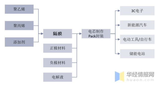 制造隔膜的上游原材料主要為聚丙烯(PP)、聚乙烯(PE)及添加劑等基體材料,輔料為包裝材料、生產輔料等,上游原材料供應商眾多,選擇余地相對較大。設備層面,制造隔膜需要制膜主線、收卷分切設備、濕法主線配套設備、涂布設備、萃取設備、電控系統、廢液回收、鍋爐(導熱油)、溫控及管道、制漿設備、原料罐、上料系統、白油純化系統、起重設備等;下游主要對應鋰電池,終端應用領域于3C電子、新能源汽車和儲能電站。