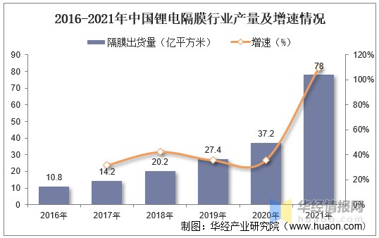 2016-2021年中國鋰電隔膜行業產量及增速情況