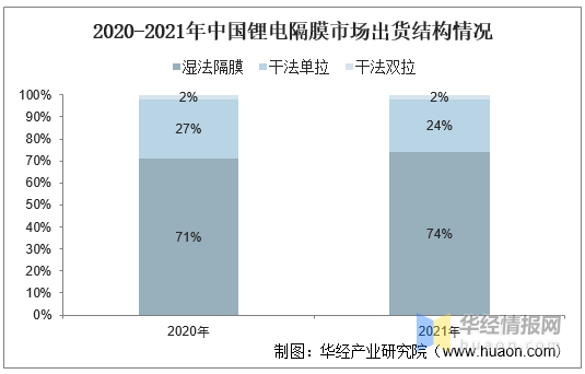 從出貨結構來看,濕法隔膜占主導地位。據統計,2021年鋰電隔膜出貨市場,濕法占比達74%,干法單拉市場占比為24%,干法雙拉市場占比為2%。