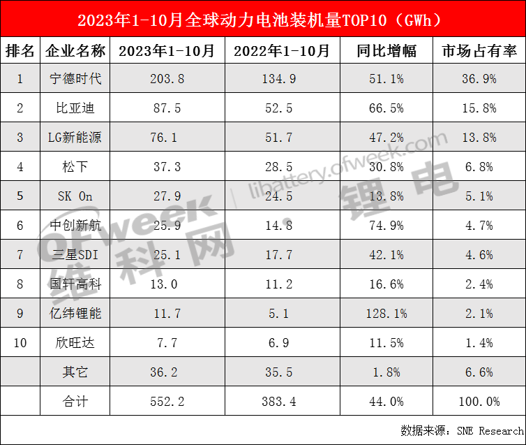 1-10月全球動(dòng)力電池裝車量TOP10的企業(yè)分別是:寧德時(shí)代、比亞迪、LG新能源、松下、SK On、中創(chuàng)新航、三星SDI、國(guó)軒高科、億緯鋰能、欣旺達(dá)。