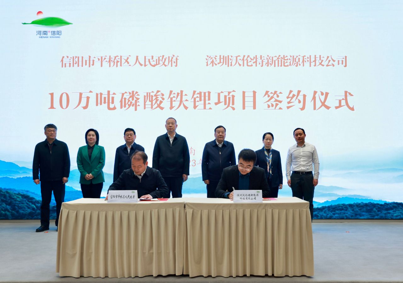 12月29日,信陽市平橋區(qū)人民政府與深圳沃倫特新能源科技有限公司10萬噸磷酸鐵鋰項目簽約儀式在信商之家舉行。