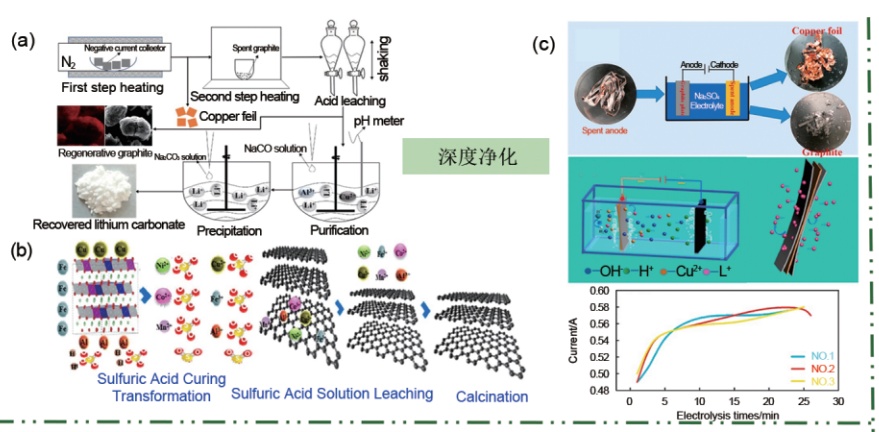石墨回收方法:(a)無機酸回收;(b)硫酸固化法;(c)電化學法