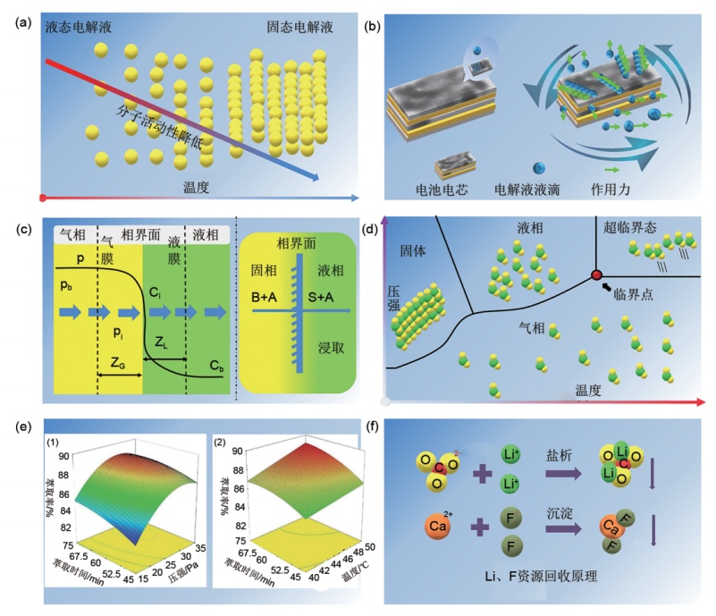 不同電解液回收的機理示意圖:(a)冷凍法;(b)機械離心法;(c)有機溶劑萃取法;(d)、(e)超臨界二氧化碳萃取法;(f)鋰鹽回收方法(來源:張群斌等,《廢舊電池電解液回收及高值化利用研發進展》)