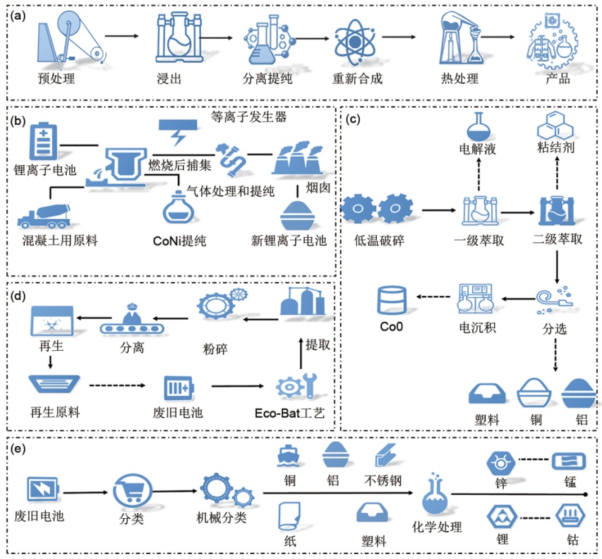 國內外企業回收鋰電池電解液案例:(a)格林美工藝;(b)比利時Umicore工藝;(c)英國AEA工藝;(d)日本OnTo工藝;(e)法國Recupyl工藝