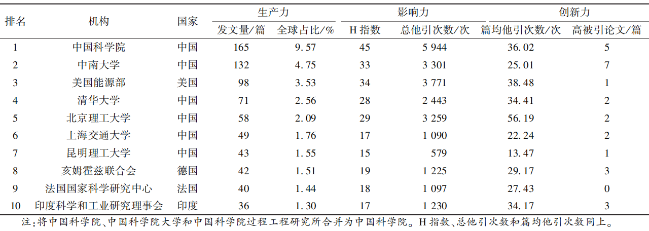 影響力方面,以H指數、總他引次數和篇均他引次數為衡量指標,結果顯示:中國科學院、中南大學和美國能源部居H指數和總他引次數的前三位;北京理工大學、中國科學院和美國能源部位列篇均他引次數前三位。