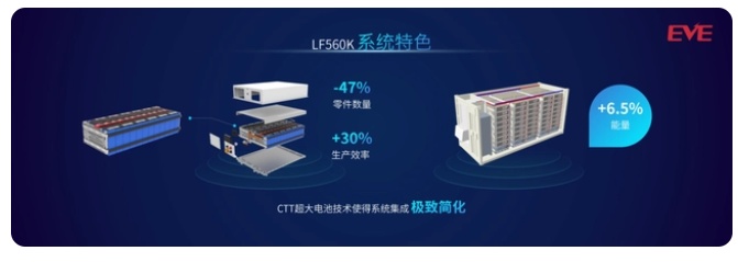 在系統集成的應用中,相較于LF280K電池,使用LF560K電池可減少電芯數量50%、簡化Pack零部件數量47%,提升生產效率30%。此外,通過簇級別尺寸的優(yōu)化,可提高集裝箱電量6.5%,適配行業(yè)標準集成方案,降低客戶使用成本。