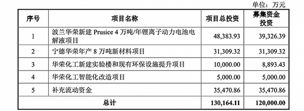 首次IPO,瑞泰新材計劃募資12億元,其中,3.93億元將用于波蘭華榮新建Prusice4萬噸/年鋰離子動力電池電解液項目,3.13億元將用于寧德華榮年產8萬噸新材料項目,0.89億元將用于華榮化工新建實驗樓和現有環保設施提升項目,0.50億元將用于華榮化工智能化改造項目,以及3.55億元將用于補充流動資金。