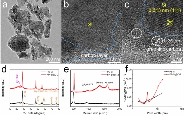 圖1.FP-Si@C-2復(fù)合材料的物性表征:(a)TEM圖片;(b,c)HRTEM圖片;(d)XRD譜圖;(e)Raman譜圖;(f)孔徑分布。