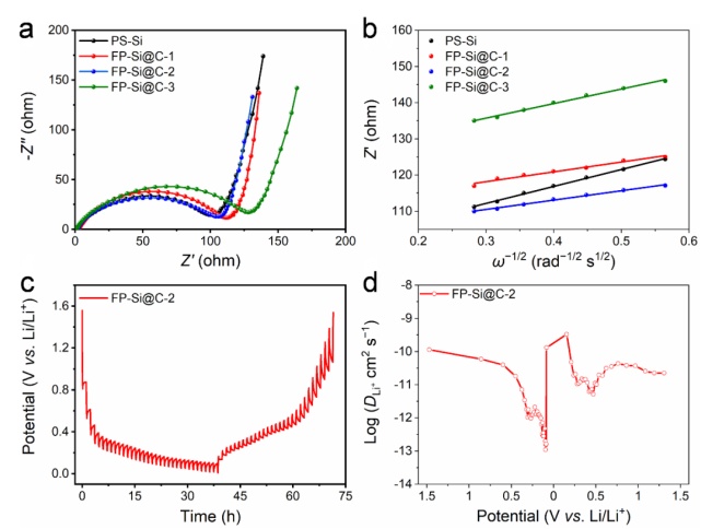 圖3.FP-Si@C-2復(fù)合負(fù)極的動(dòng)力學(xué)分析:(a)EIS譜圖;(b)Z′和ω-1/2的擬合曲線;(c)GITT曲線;(d)Li+擴(kuò)散系數(shù)。