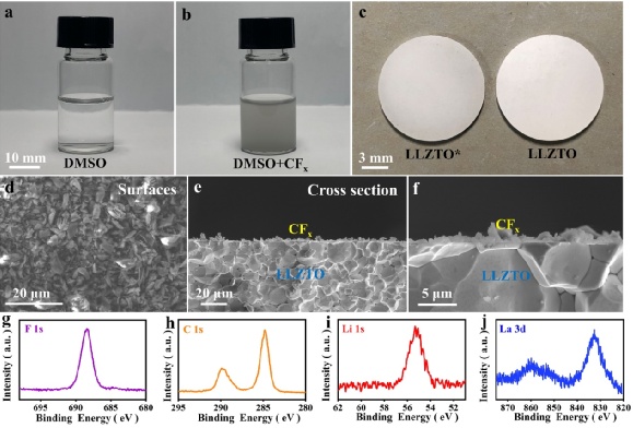 圖2.CFx溶液處理LLZTO電解質的制備和表征。(a,b)CFx溶液的制備。(c)原始LLZTO固態電解質和用CFx溶液處理后的LLZTO電解質(LLZTO*)的光學照片。(d)LLZTO*電解質的表面SEM照片。(e,f)LLZTO*電解質的截面SEM照片。(g-j)LLZTO*電解質的XPS分析結果。