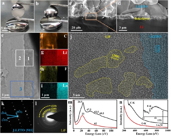 圖3.Li/LLZTO*界面的構造和cryo-TEM表征。(a,b)LLZTO*電解質片用熔融Li處理的前后照片。(c,d)Li/LLZTO*界面的SEM照片。(e)Li/LLZTO*界面的cryo-TEM照片。(f-i)e圖中藍色區域的EELS-Mapping。(j)Li/LLZTO*界面的cryo-HRTEM照片。(k,l)e圖中的區域1和區域2的衍射照片。(m,n)e圖中的區域1和區域2的EELS譜。