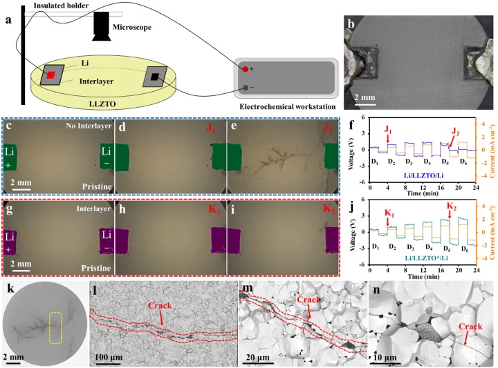 圖5.LLZTO電解質中鋰枝晶生長的原位光學實驗。(a)原位光學實驗的示意圖。(b)Li/LLZTO*/Li對稱電池的原位光學實驗照片。(c-e)在不同電流密度下的LLZTO電解質中鋰枝晶沉積和溶解的過程。(f)c-e圖中對應的電化學曲線。(g-i)在不同電流密度下的LLZTO*電解質中鋰枝晶沉積和溶解的過程。(j)g-i圖中對應的電化學曲線。(k)短路的LLZTO電解質的照片。(l-n)短路的LLZTO電解質截面SEM照片。SEM照片來自(k)中的黃色方框區域位置。