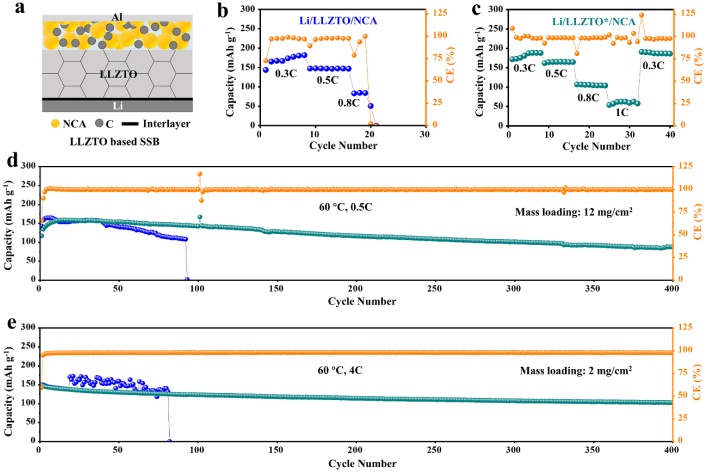 圖6.固態全電池的電化學性能。(a)基于LLZTO*電解質的全電池示意圖。(b,c)全電池Li/LLZTO/NCA和Li/LLZTO*/NCA的倍率性能。(d,e)全電池Li/LLZTO/NCA和Li/LLZTO*/NCA的長循環性能。