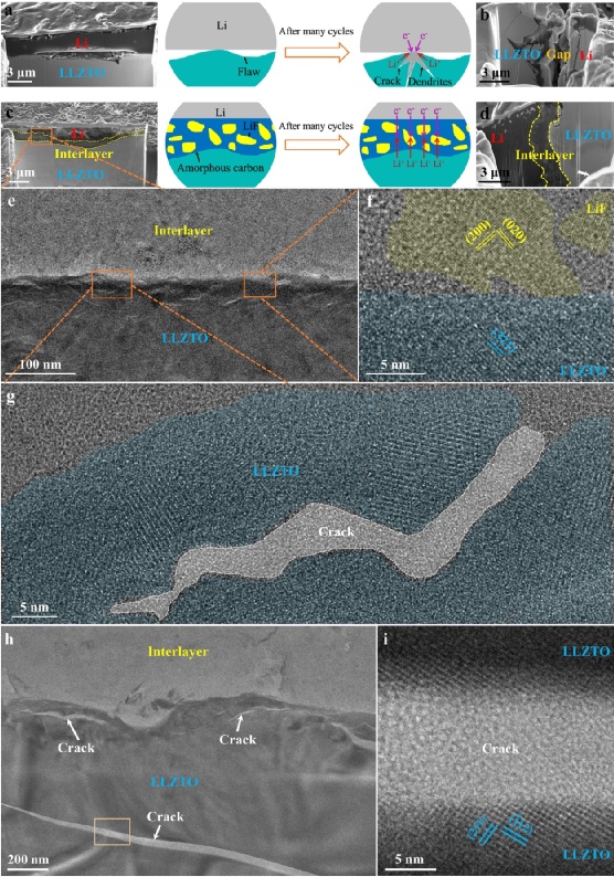 圖7.富LiF界面層實現無枝晶石榴石型固態鋰金屬電池的示意圖。(a,b)Li/LLZTO/Li對稱電池循環前后Li金屬和LLZTO電解質之間界面的SEM圖像,電解質和鋰之間存在明顯的間隙。(c,d)Li/LLZTO*/Li對稱電池循環前后Li金屬和LLZTO電解質之間界面的SEM圖像,電解質和金屬鋰之間接觸良好。(e)Li/LLZTO*/Li對稱電池循環前Li/LLZTO*界面的cryo-TEM照片。(f,g)e圖中的橙色區域的cryo-HRTEM照片。機械打磨使得LLZTO電解質表面產生大量的微裂紋。界面層中的LiF均勻的分布在非晶碳中。(h)Li/LLZTO*/Li對稱電池循環后Li/LLZTO*界面的cryo-TEM照片。Li/LLZTO*/Li對稱電池長時間循環后,富LiF界面層與LLZTO仍然保持密切接觸。(i)h圖中的微裂紋的cryo-HRTEM照片。