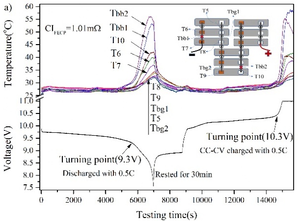 當(dāng)FECP存在于串聯(lián)電路上,可以很容易地通過監(jiān)測連接點(diǎn)溫度的變化而檢測出來(圖1b),但是若FECP存在與并聯(lián)電路中,在充放電早期是不能通過溫度檢測來發(fā)現(xiàn)該問題連接點(diǎn)的存在,只有在充放電末期的電壓拐點(diǎn)出現(xiàn)后(圖1a),并聯(lián)電路中的FECP才會呈現(xiàn)出溫度高于其他正常連接點(diǎn)的特征。盡管如此,充放電過程中電池組中存在的FECP的溫度最終定會高于其他正常連接點(diǎn)的溫度,導(dǎo)致與FECP相鄰電池的溫度高于其他電池,進(jìn)而影響電池循環(huán)壽命或安全性能。