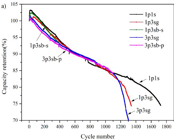 研究了FECP對循環(huán)壽命的影響,在室溫下以1C倍率進(jìn)行充放電循環(huán)測試,電池組中的FECP的阻值控制在0.4mΩ。結(jié)果表明,在沒有電池均衡管理系統(tǒng)控制的情況下,以容量衰減至80%或單體電池放電末端電壓降至2V為循環(huán)截止條件,正常3P3S和1P3S電池組循環(huán)壽命分別為1210次和1260次,均少于單體電池的1510次(充放電電壓區(qū)間為2.5-3.65V)(圖3a),而3P并聯(lián)模塊中存在一個(gè)FECP的3P3S電池組及串聯(lián)電路上有一個(gè)FECP的1P3S電池組分別在1097次和381次時(shí),因有單體電池放電末端電壓低于2.0V而自動(dòng)停止循環(huán)。同時(shí),隨著循環(huán)次數(shù)的增加,電池組放電結(jié)束時(shí)單體電池的最高電壓和最低電壓之間的電壓差越來越大(圖3b),這也是電池健康狀態(tài)的一個(gè)特征數(shù)據(jù),存在FECP的電池組的放電壓差要遠(yuǎn)遠(yuǎn)高于正常電池組,但相同情況下電池組的放電壓差要遠(yuǎn)高于充電壓差。
