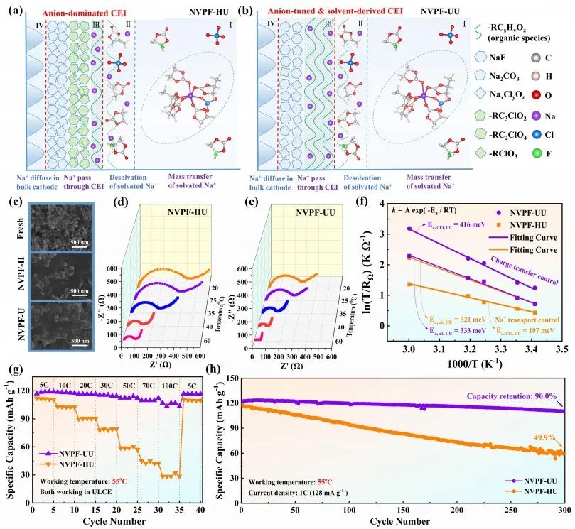 圖3界面過程和動力學。(a-b)NVPF-HU和NVPF-UU系統中電極/電解質界面示意圖;(c)經過10次活化循環的NVPF-H和NVPF-U正極的SEM圖;(d-e)NVPF-HU和NVPF-UU的Nyquist圖;(f)NVPF-HU和NVPF-UU體系中Na+通過CEI和去溶劑化過程的Arrhenius圖和計算活化能;(g)NVPF-HU和NVPF-UU的倍率性能;(h)在55℃下,NVPF-HU和NVPF-UU的循環穩定性測試。
