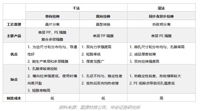 根據技術路線不同,電池隔膜可分為干法工藝隔膜和濕法工藝隔膜,后者整體性能更優,更契合高能量密度電池,2021年濕法隔膜出貨量占全部隔膜的比例超過70%。另外,涂覆工藝可以有效改善材料熱穩定性和機械強度,使得濕法隔膜性能更加出色。干法隔膜和濕法隔膜在工藝及性能上的具體區別如下表所示。