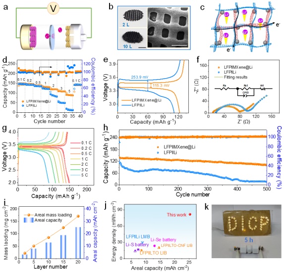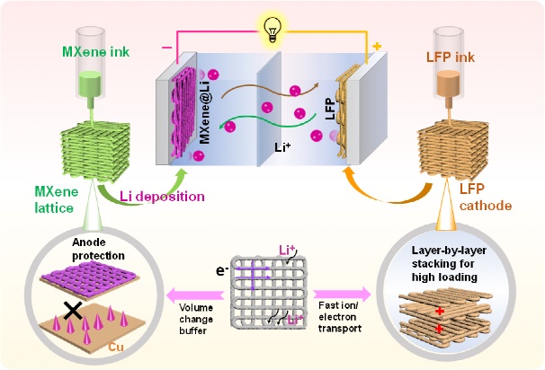 3D打印鋰金屬電池的過(guò)程如圖1所示,通過(guò)逐層打印Ti3C2TxMXene框架沉積鋰金屬與超厚磷酸鐵鋰正極,構(gòu)筑出高面積能量密度、長(zhǎng)壽命鋰金屬電池。