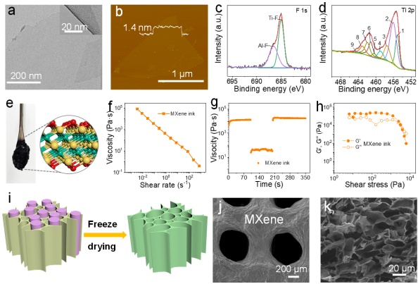 所制備的3D打印MXene油墨(~300mg/mL)表現(xiàn)出高粘度及流變剪稀的特性,可定制化打印幾何圖案以及實(shí)現(xiàn)多層打印電極。所打印的MXene電極表現(xiàn)出多孔框架結(jié)構(gòu),形成良好的電子/離子傳輸通道。