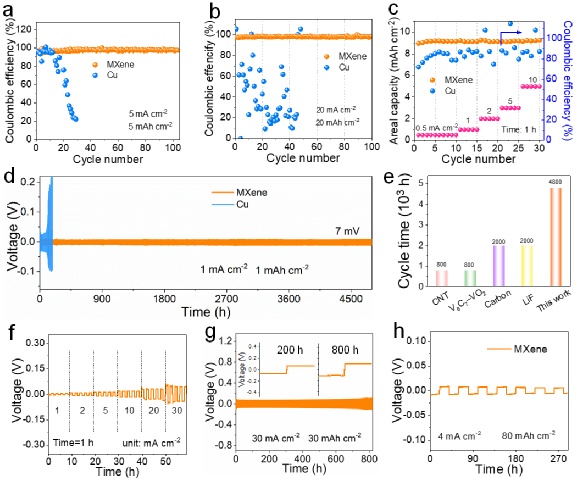 圖3.MXene電極沉積金屬鋰電化學(xué)性能。