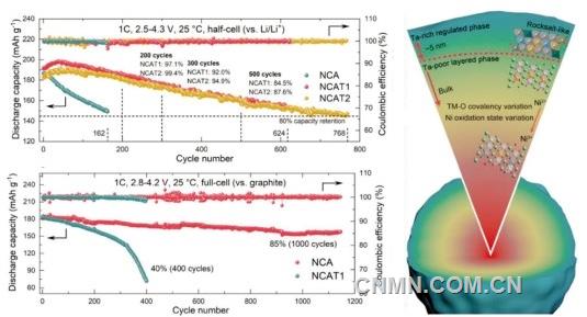 國家動力電池創新中心創新團隊牢記以技術創新引領行業高質量發展使命,保持深耕細作、求真務實科研作風,圍繞行業共性技術需求,不斷提升技術服務能力,服務新能源汽車行業應用需求。針對高比能動力電池在安全、壽命、成本等方面存在的問題,創新團隊通過多維度調研分析,找準共性問題,開展電池檢測驗證、機理解析,確定關鍵技術因素。經過多輪次研討,從電池關鍵材料著手,精細設計核殼梯度正極材料結構,引入電子態摻雜技術,開發表面改性新方法。經過一年多的技術攻關,從材料設計、實驗研究驗證到工程化技術開發,批量試制成功性能優異的高鎳正極材料。所開發材料兼顧了穩定表面結構、良好電荷傳遞性能,具備優異的熱穩定性和循環穩定性,實現低成本工程化,行業專家鑒定達到國際先進水平。部分研究成果以論文形式發表于能源領域國際頂級學術期刊Small(IF=15.153),題目為“Structureand Charge Regulation Strategy Enabling Superior Cyclability for Ni-RichLayered Cathode Materials”。