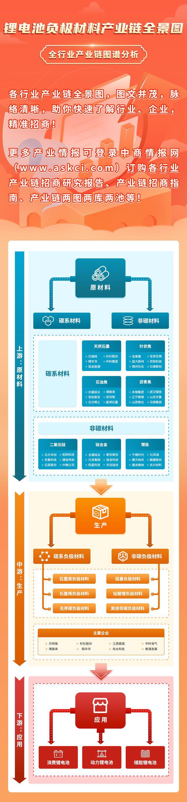 鋰電池負極材料上游主要包括天然石墨、石油焦、針狀焦、瀝青焦、二氧化硅、鋰鹽等原料,中游可分為碳系負極材料和非碳負極材料,下游應用于動力鋰電池、消費鋰電池、儲能鋰電池等領域。