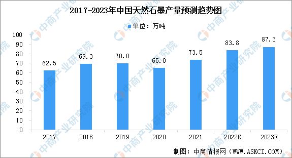 在鋰離子電池、電弧爐鋼鐵等行業的推動下,我國天然石墨產量逐年增長。數據顯示,2017-2021年國內天然石墨產量從62.5萬噸增長至73.5萬噸,期內年均復合增長率為4.14%。未來隨著包括耐火材料、潤滑油和鋰離子電池在內的下游行業的需求不斷攀升,中國天然石墨產量預計將在2023年達87.3萬噸。