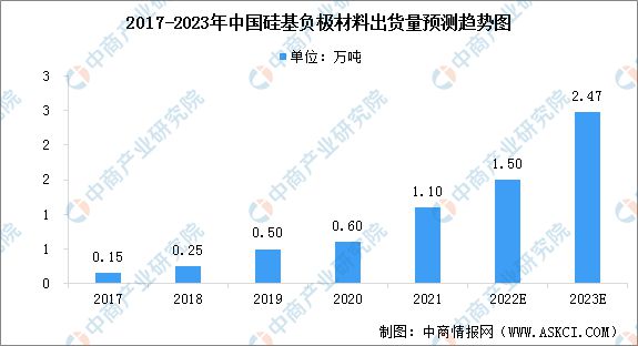 近年來,中國硅基負極材料正在不斷發展,硅基負極市場迎來快速增長,出貨量預計大幅增加。2021年硅基負極材料出貨量達1.1萬噸,同比增長83%,占負極材料出貨量的1.5%。隨著特斯拉4680電池的量產以及大圓柱電池的推廣應用,未來將繼續增長,預計2023年將達2.47萬噸。