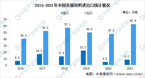 我國負極材料出口遠大于進口,進出口貿易順差。數據顯示,2021年中國負極材料出口量62.8萬噸,同比增長31.4%,出口量超過此前2018年的最高值57.1萬噸,創歷史最高水平。2021年中國負極材料進口數量為8.2萬噸,同比增長84.5%。