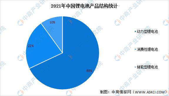從鋰電池產品結構來看,我國鋰電池主要分為動力型鋰電池、消費型鋰電池和儲能型鋰電池三大類,廣泛應用于電動汽車、手機、筆記本電腦、電動自行車、電動工具、數碼相機和儲能等眾多下游領域。數據顯示,2021年受新能源汽車發展帶動,鋰電池市場中動力型鋰電池產量最大,為220GWh,占比達到68%。其次為消費型鋰電池,占比為22%,儲能型鋰電池占比最低,僅有10%。