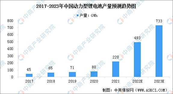 2021年,我國新能源汽車產量超350萬輛,帶動國內動力電池出貨量增長。同時,歐洲新能源汽車市場繼續高增長,帶動國內部分頭部電池企業出口規模提升,我國動力型鋰電池產量呈高增長態勢。數據顯示,2021年我國動力性鋰電池產量達220GWh,預計2023年將達733GWh。