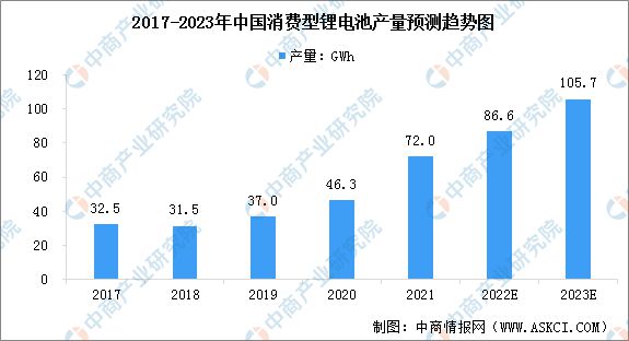 近年來,隨著我國經濟的快速發展以及居民消費能力的持續提升,我國3C數碼類、電動工具類和小動力類產品需求量不斷擴大,為消費型鋰電池市場發展奠定了堅實的應用基礎。2017-2021年,我國消費型鋰電池以22%的復合年均增長率由32.5GWh增長到72GWh,預計2023年將達105.7GWh。