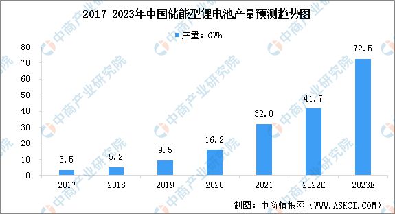 在風電、光伏裝機量持續增長與5G基站建設加快的背景下,儲能鋰電池需求快速增長。儲能電池作為儲能系統的核心環節,未來受益于下游市場的高景氣度,市場容量將有望持續快速擴大。2021年我國儲能型鋰電池產量達32GWh,預計2023年將達72.5GWh。