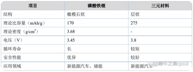 目前應(yīng)用于動力鋰電池的主流正極材料包括磷酸鐵鋰和三元材料,具體對比如下。