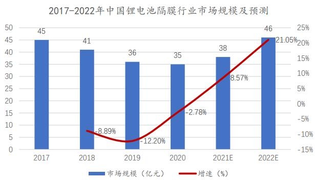 根據(jù)華經(jīng)產(chǎn)業(yè)研究院數(shù)據(jù)顯示,2017-2020 年中國(guó)鋰電池隔膜行業(yè)市場(chǎng)規(guī)模呈現(xiàn)下降趨勢(shì),到 2020 年中國(guó)鋰電池隔膜行業(yè)市場(chǎng)規(guī)模下降至 35 億元。其中2019 年市場(chǎng)規(guī)模下降的主要原因是鋰電隔膜國(guó)產(chǎn)化比例大幅提升,加之企業(yè)產(chǎn)能規(guī)模化效應(yīng)提升,導(dǎo)致隔膜成本進(jìn)一步下降,價(jià)格下降,2020 年是由于受到新冠疫情的影響。隨著新冠疫情得到控制以及隔膜出貨量的上升,未來我國(guó)鋰電池隔膜行業(yè)市場(chǎng)規(guī)模將逐漸回升,預(yù)計(jì)到 2022 年將達(dá)到 46 億元的水平。
