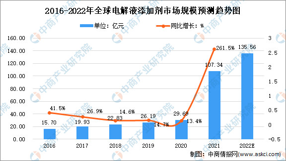 2021年全球鋰電池電解液添加劑的市場規模約107.35億元,同比增長261.5%,2016年至2021年均復合增長率為56.88%。中商產業研究院預測,到2022年全全球鋰電池電解液添加劑的規模將達到135.56億元。
