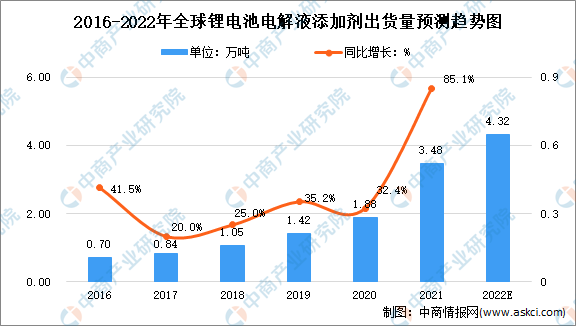 2021年全球鋰電池電解液添加劑的市場出貨量約3.58萬噸,同比增長85.1%,2016年至2021年均復合增長率為37.8%。中商產業研究院預測,到2022年全球鋰電池電解液添加劑的需求量將達到5.32萬噸。