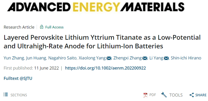 近日,上海交通大學化學化工學院楊立教授團隊與重慶大學楊小龍等人合作,在能源類國際權威期刊《Advanced Energy Materials》上發表了題為“層狀鈣鈦礦結構的鈦酸釔鋰作為低電壓、高倍率鋰離子電池負極材料(Layered Perovskite Lithium Yttrium Titanateasa Low-potential and Ultrahigh-rate Anode for Lithium-ion Batteries)”的研究論文。該論文首次詳細研究了鈦酸釔鋰作為鋰離子電池低電壓、高倍率負極材料的潛在價值,為設計新型儲鋰穩定的低電壓負極材料提供了新的思路。上海交通大學博士生張赟為論文的第一作者,楊立教授、章正熙副研究員和重慶大學楊小龍副教授為論文共同通訊作者,上海交通大學為第一通訊單位。